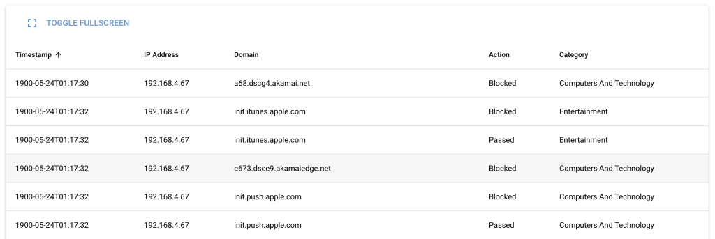 All DNS activity — allowed and blocked — is logged in full detail. Our detailed logs include: